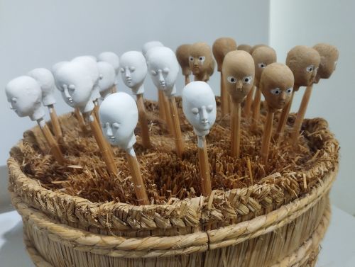 面白かったのが、頭を形どり、目になるガラスを入れ込み、そこからまたコーティングして、目をかたどるというもの。