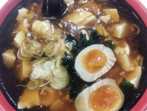醤油味のスープに、豆腐と挽肉の餡かけが麺のうえにのっているラーメン。