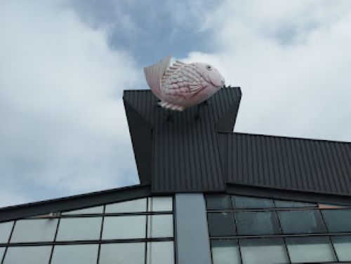 魚は、鯛で、水産棟である目印。